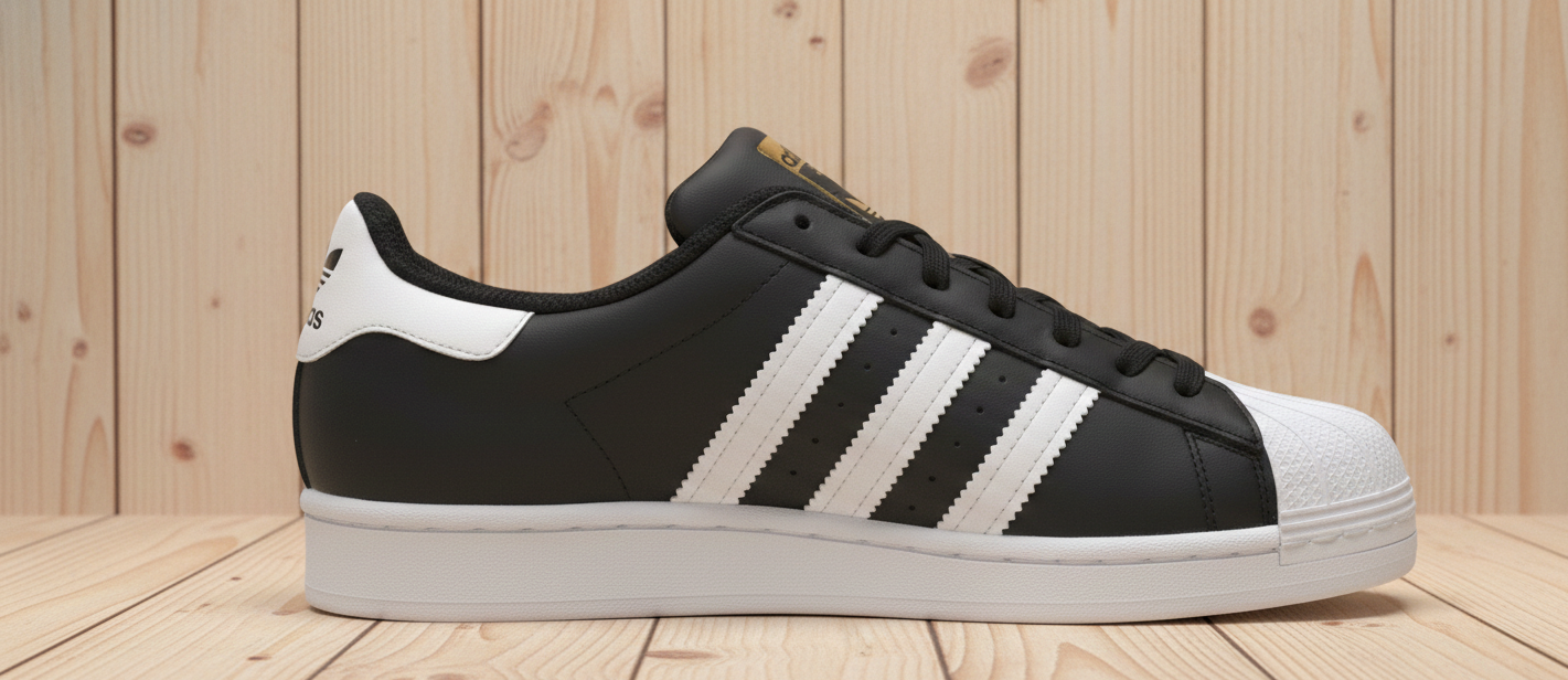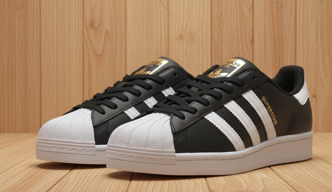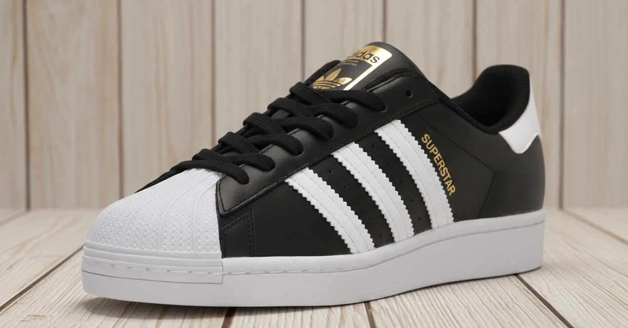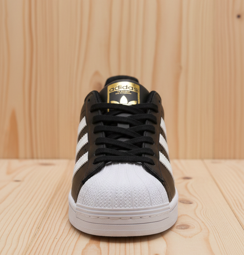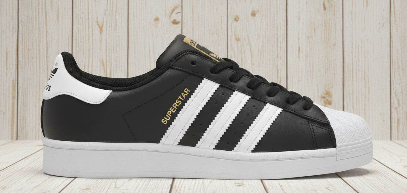 Adidas Superstar, especificamente na clássica coloração preta com listras brancas. Originalmente projetado para o basquete, ele se tornou um marco da moda urbana, do hip hop e do skate.